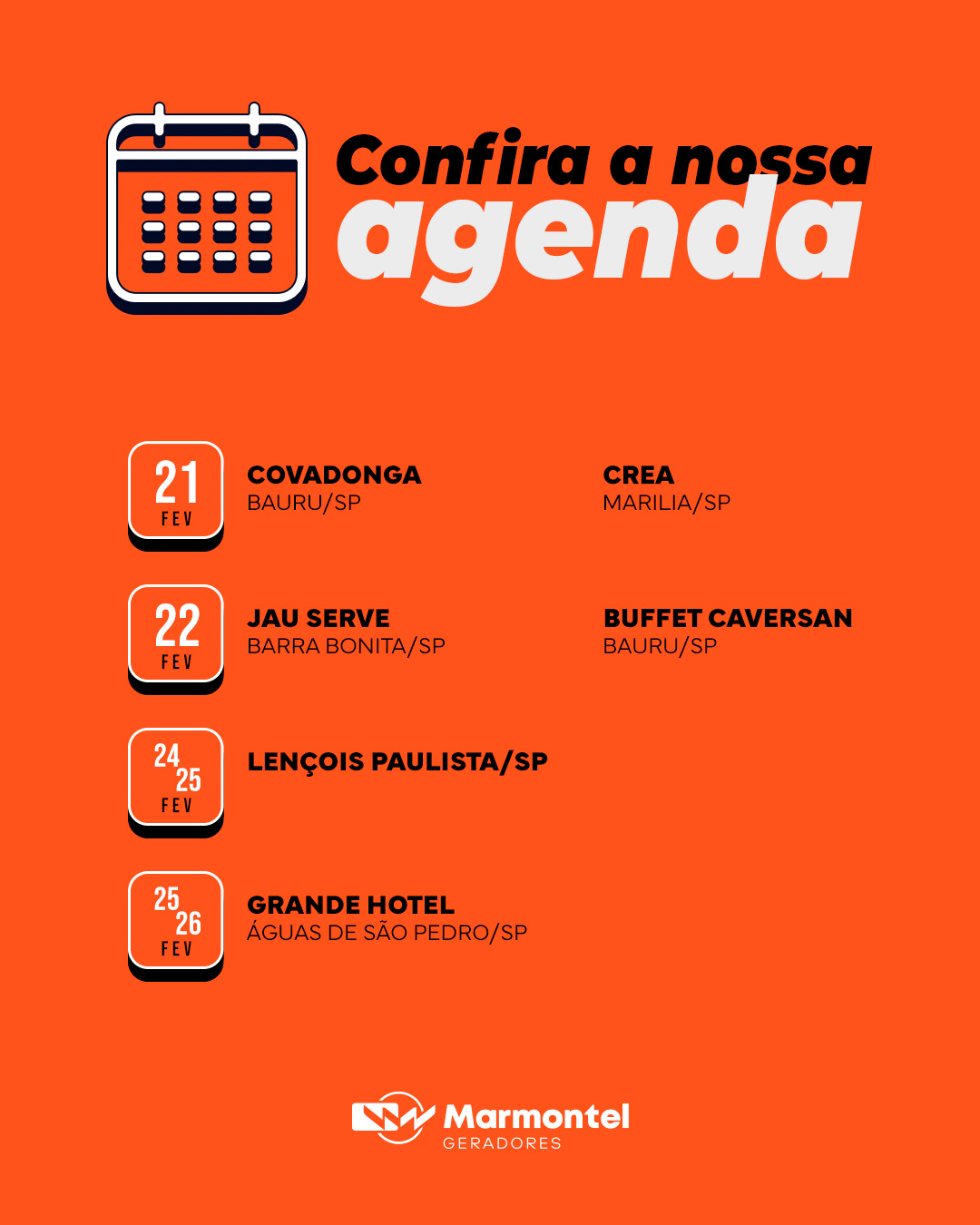 Entre os dias 21 e 26 de fevereiro, a Marmontel Geradores segue com agenda ativa em diferentes cidades do interior paulista, atendendo eventos sociais, corporativos e institucionais. A programação começa no dia 21, com fornecimento de energia para o Covadonga, em Bauru, e para o CREA, em Marília, estruturas que exigem estabilidade e operação contínua.